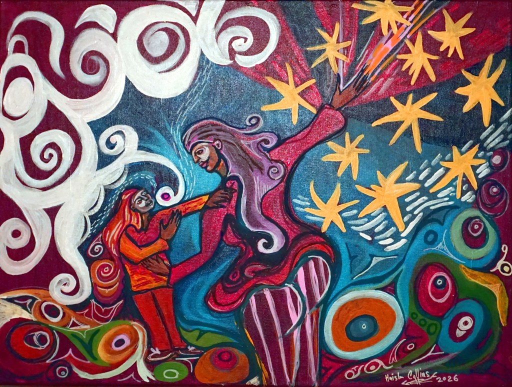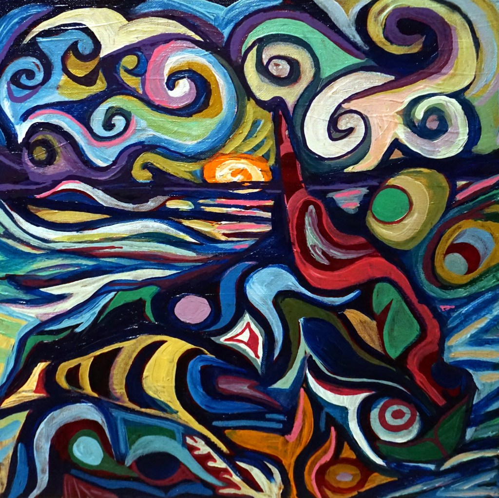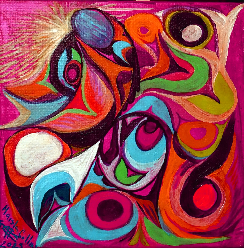 “Enchanted Voyage” 2025, 8″ X10″, NFS, prints are available, contact me for details. “Almost Figurative” 2025, 20″x10″, Acrylic on Canvas, NFS, available as reproduction “The Sentimental Side” Original 12″ X12″ NFS, reproductions available. “Hold on Honey, I’m Reaching for the Stars” 20″ x 24″ , 2025, Reproductions available“Sunset at Blackfish Rock” 14″x14″. 2025, Acrylic on Canvas“Tree Grows on Indigenous Land” 20″X25″. 2025, Acrylic on Canvas